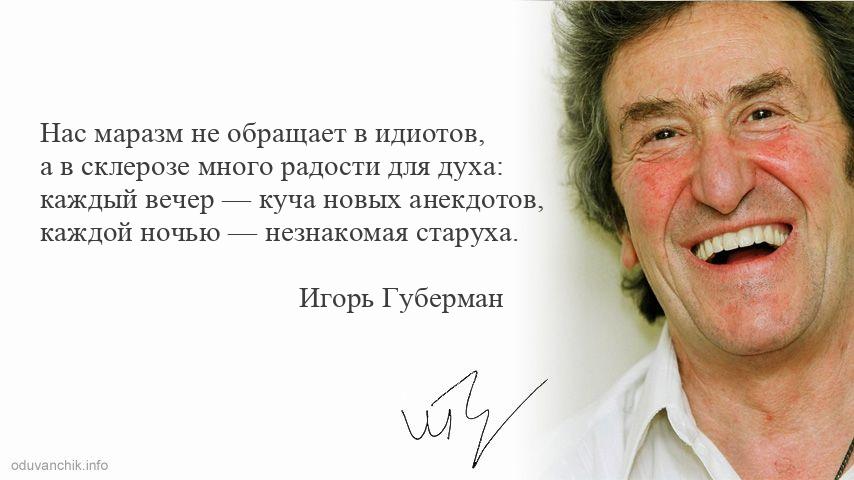 | Нас маразм не обращает в идиотов, а в склерозе много радости для духа: каждый вечер — куча новых анекдотов, каждой ночью — незнакомая старуха. |