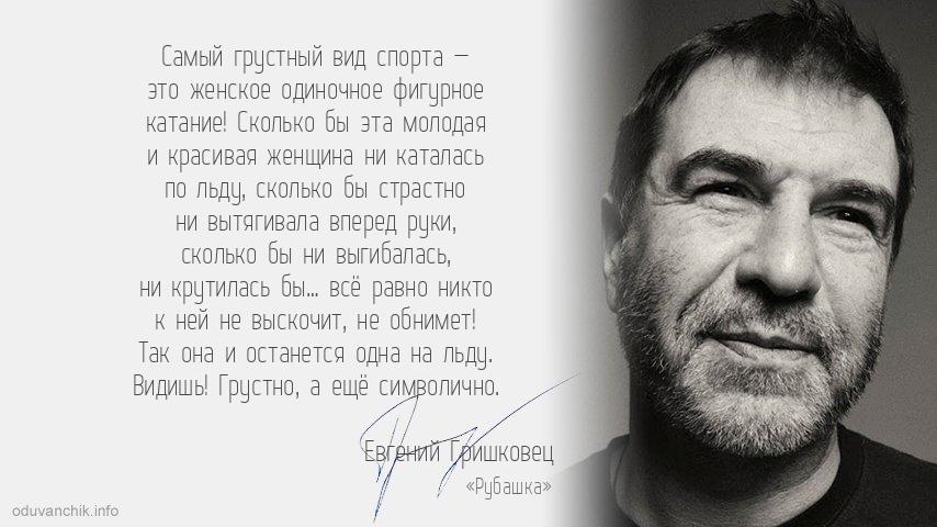 | Самый грустный вид спорта — это женское одиночное фигурное катание! Сколько бы эта молодая и красивая женщина ни каталась по льду, сколько бы страстно ни вытягивала вперед руки, сколько бы ни выгибалась, ни крутилась бы… всё равно никто к ней не выскочит, не обнимет! Так она и останется одна на льду. Видишь! Грустно, а ещё символично. |