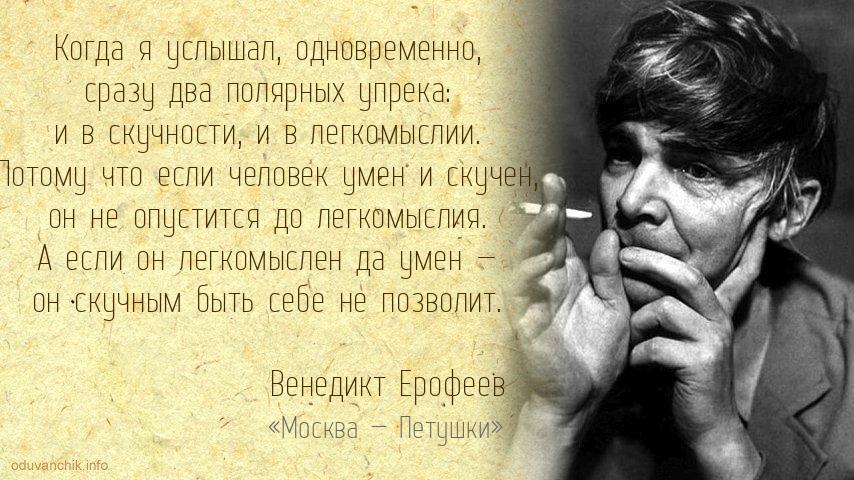 «Когда я услышал, одновременно, сразу два полярных упрека: и в скучности, и в легкомыслии. Потому что если человек умен и скучен, он не опустится до легкомыслия. А если он легкомыслен да умен — он скучным быть себе не позволит.»
