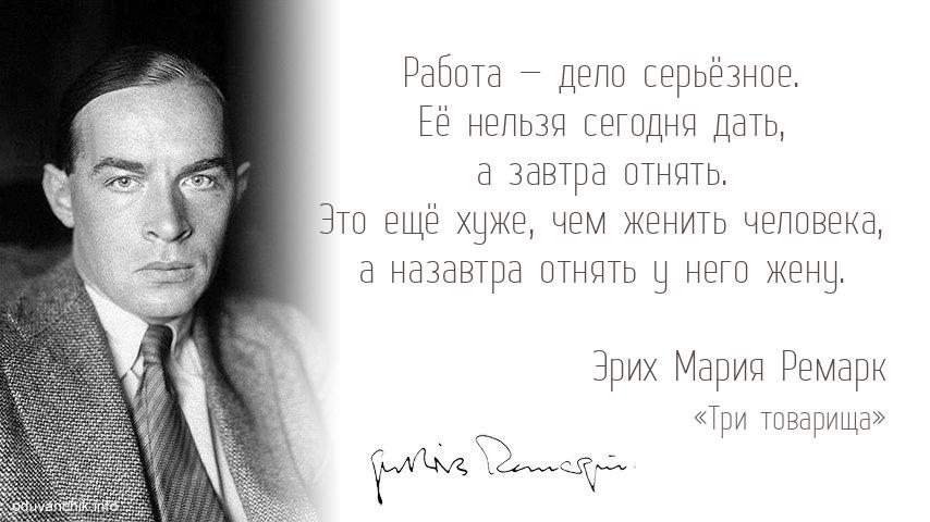 | Работа — дело серьёзное. Её нельзя сегодня дать, а завтра отнять. Это ещё хуже, чем женить человека, а назавтра отнять у него жену. |