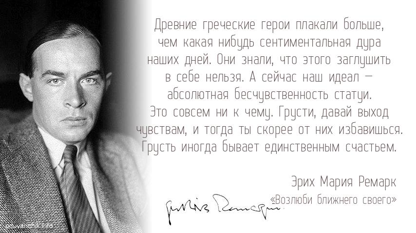| Древние греческие герои плакали больше, чем какая нибудь сентиментальная дура наших дней. Они знали, что этого заглушить в себе нельзя. А сейчас наш идеал — абсолютная бесчувственность статуи. Это совсем ни к чему. Грусти, давай выход чувствам, и тогда ты скорее от них избавишься. Грусть иногда бывает единственным счастьем. |