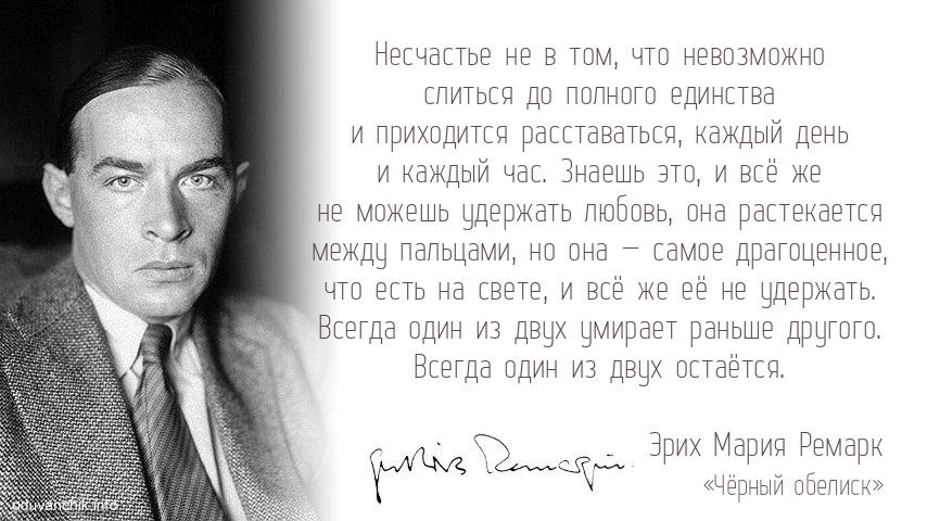 «Несчастье не в том, что невозможно слиться до полного единства и приходится расставаться, каждый день и каждый час. Знаешь это, и всё же не можешь удержать любовь, она растекается между пальцами, но она — самое драгоценное, что есть на свете, и всё же её не удержать. Всегда один из двух умирает раньше другого. Всегда один из двух остаётся.»