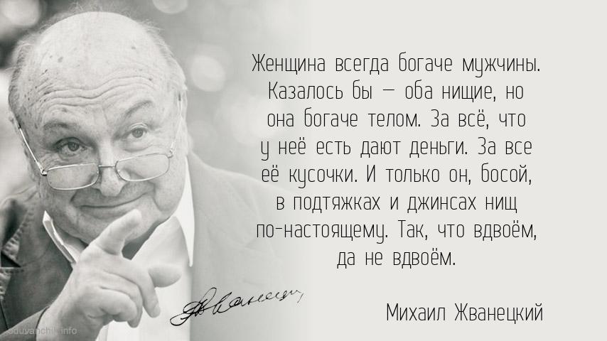 «Женщина всегда богаче мужчины. Казалось бы — оба нищие, но она богаче телом. За всё, что у неё есть дают деньги. За все её кусочки. И только он, босой, в подтяжках и джинсах нищ по-настоящему. Так, что вдвоём, да не вдвоём.»