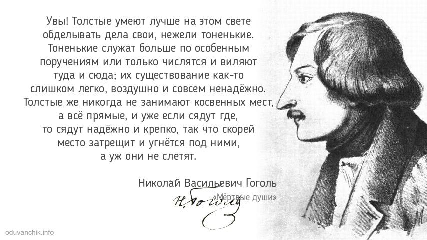 | Увы! Толстые умеют лучше на этом свете обделывать дела свои, нежели тоненькие. Тоненькие служат больше по особенным поручениям или только числятся и виляют туда и сюда; их существование как-то слишком легко, воздушно и совсем ненадёжно. Толстые же никогда не занимают косвенных мест, а всё прямые, и уже если сядут где, то сядут надёжно и крепко, так что скорей место затрещит и угнётся под ними, а уж они не слетят. |