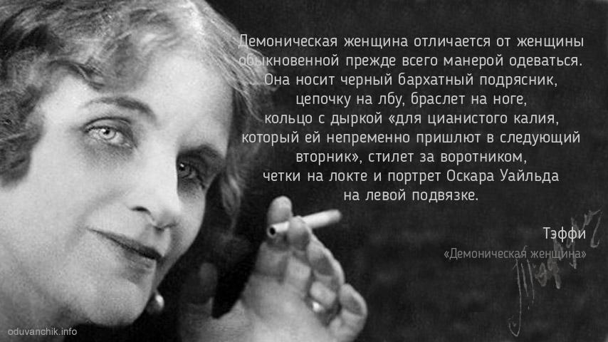 | Демоническая женщина отличается от женщины обыкновенной прежде всего манерой одеваться. Она носит черный бархатный подрясник, цепочку на лбу, браслет на ноге, кольцо с дыркой «для цианистого калия, который ей непременно пришлют в следующий вторник», стилет за воротником, четки на локте и портрет Оскара Уайльда на левой подвязке. |