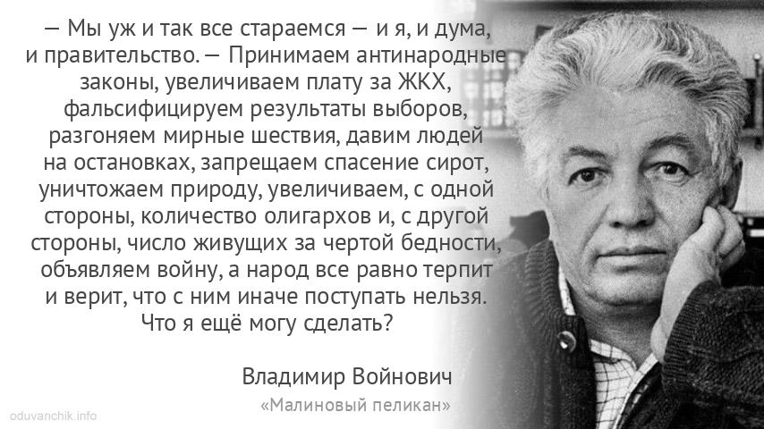 | — Мы уж и так все стараемся — и я, и дума, и правительство. — Принимаем антинародные законы, увеличиваем плату за ЖКХ, фальсифицируем результаты выборов, разгоняем мирные шествия, давим людей на остановках, запрещаем спасение сирот, уничтожаем природу, увеличиваем, с одной стороны, количество олигархов и, с другой стороны, число живущих за чертой бедности, объявляем войну, а народ все равно терпит и верит, что с ним иначе поступать нельзя. Что я ещё могу сделать? |