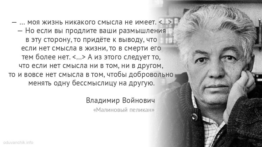 | — … моя жизнь никакого смысла не имеет. <…> — Но если вы продлите ваши размышления в эту сторону, то придёте к выводу, что если нет смысла в жизни, то в смерти его тем более нет. <…> А из этого следует то, что если нет смысла ни в том, ни в другом, то и вовсе нет смысла в том, чтобы добровольно менять одну бессмыслицу на другую. |