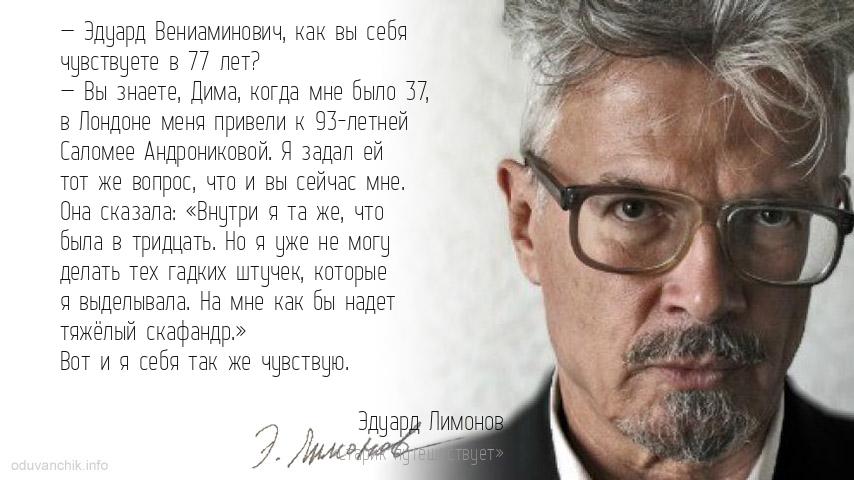 | — Эдуард Вениаминович, как вы себя чувствуете в 77 лет? — Вы знаете, Дима, когда мне было 37, в Лондоне меня привели к 93-летней Саломее Андрониковой. Я задал ей тот же вопрос, что и вы сейчас мне. Она сказала: «Внутри я та же, что была в тридцать. Но я уже не могу делать тех гадких штучек, которые я выделывала. На мне как бы надет тяжёлый скафандр.» Вот и я себя так же чувствую. |