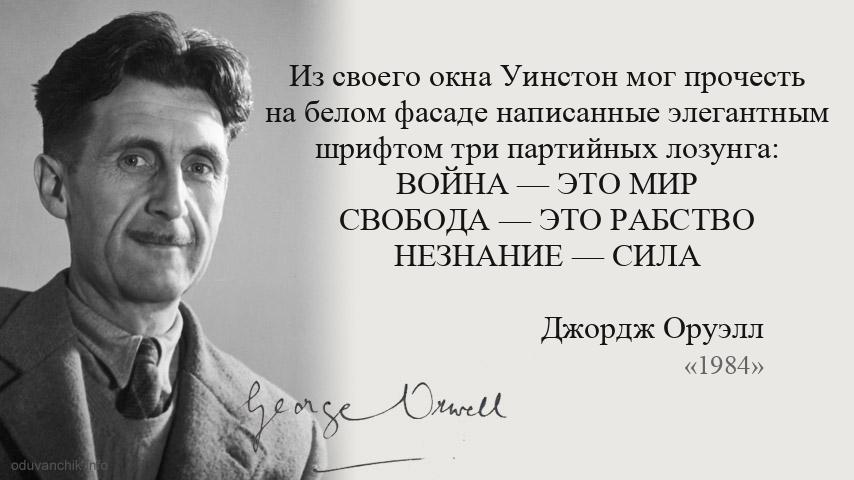 | Из своего окна Уинстон мог прочесть на белом фасаде написанные элегантным шрифтом три партийных лозунга: ВОЙНА — ЭТО МИР СВОБОДА — ЭТО РАБСТВО НЕЗНАНИЕ — СИЛА |