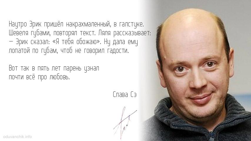 | Наутро Эрик пришёл накрахмаленный, в галстуке. Шевеля губами, повторял текст. Ляля рассказывает: — Эрик сказал: «Я тебя обожаю». Ну дала ему лопатой по губам, чтоб не говорил гадости. Вот так в пять лет парень узнал почти всё про любовь. |