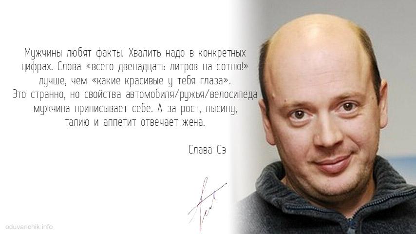 | Мужчины любят факты. Хвалить надо в конкретных цифрах. Слова «всего двенадцать литров на сотню!» лучше, чем «какие красивые у тебя глаза». Это странно, но свойства автомобиля/ружья/велосипеда мужчина приписывает себе. А за рост, лысину, талию и аппетит отвечает жена. |