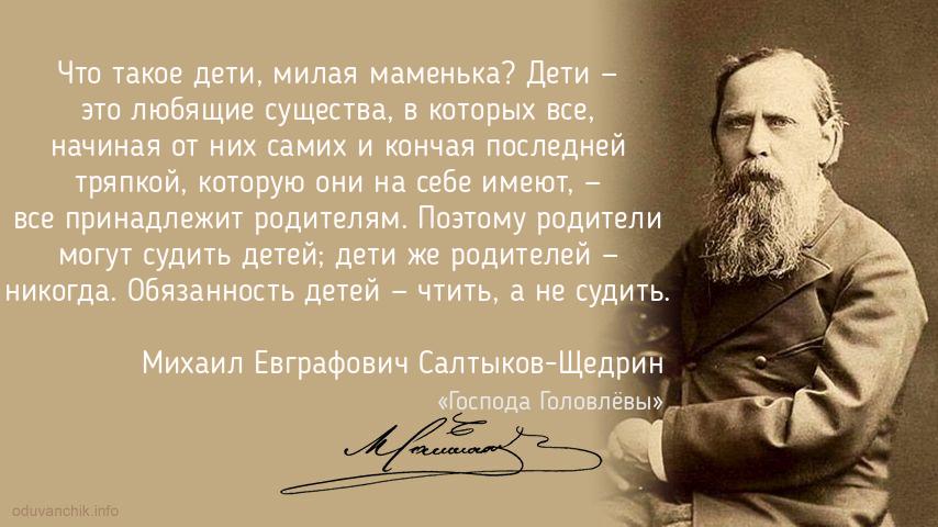 | Что такое дети, милая маменька? Дети — это любящие существа, в которых все, начиная от них самих и кончая последней тряпкой, которую они на себе имеют, — все принадлежит родителям. Поэтому родители могут судить детей; дети же родителей — никогда. Обязанность детей — чтить, а не судить. |