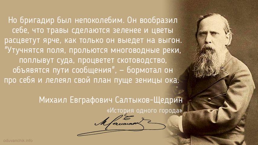 «Но бригадир был непоколебим. Он вообразил себе, что травы сделаются зеленее и цветы расцветут ярче, как только он выедет на выгон. "Утучнятся поля, прольются многоводные реки, поплывут суда, процветет скотоводство, объявятся пути сообщения", — бормотал он про себя и лелеял свой план пуще зеницы ока. »
