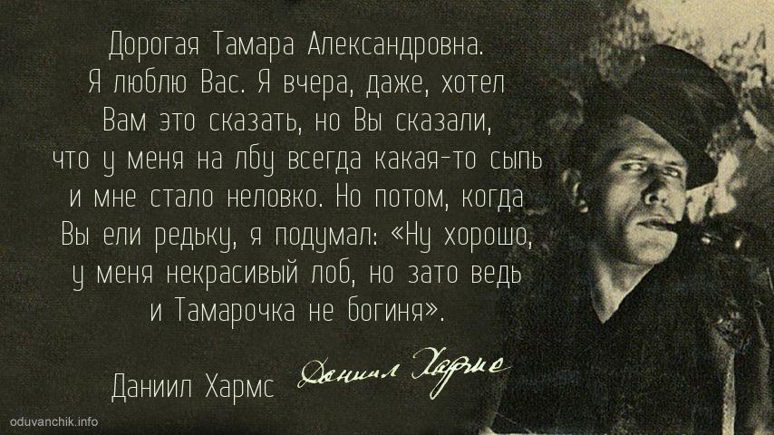 | Дорогая Тамара Александровна. Я люблю Вас. Я вчера, даже, хотел Вам это сказать, но Вы сказали, что у меня на лбу всегда какая-то сыпь и мне стало неловко. Но потом, когда Вы ели редьку, я подумал: «Ну хорошо, у меня некрасивый лоб, но зато ведь и Тамарочка не богиня». |