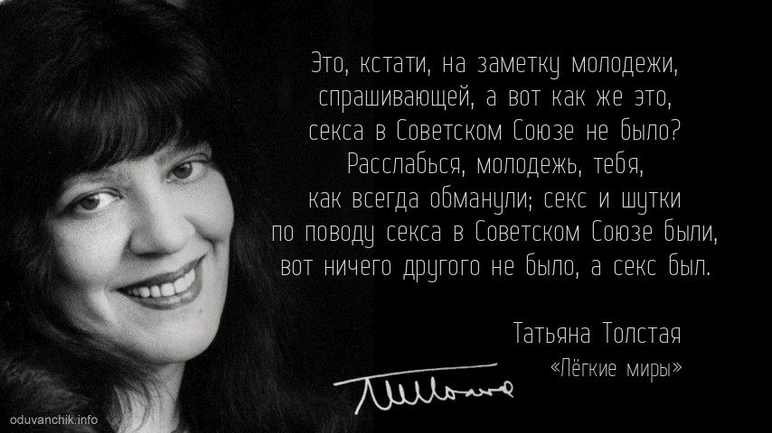 | Это, кстати, на заметку молодежи, спрашивающей, а вот как же это, секса в Советском Союзе не было? Расслабься, молодежь, тебя, как всегда обманули; секс и шутки по поводу секса в Советском Союзе были, вот ничего другого не было, а секс был. |
