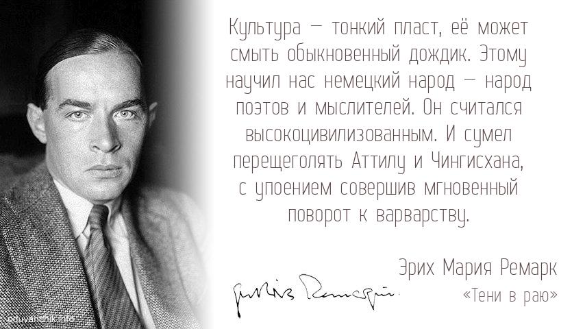 | Культура — тонкий пласт, её может смыть обыкновенный дождик. Этому научил нас немецкий народ — народ поэтов и мыслителей. Он считался высокоцивилизованным. И сумел перещеголять Аттилу и Чингисхана, с упоением совершив мгновенный поворот к варварству. |