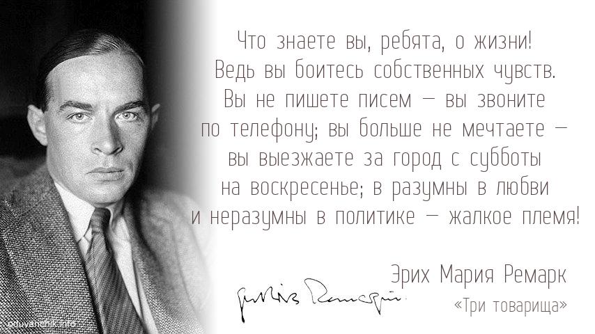 | Что знаете вы, ребята, о жизни! Ведь вы боитесь собственных чувств. Вы не пишете писем — вы звоните по телефону; вы больше не мечтаете — вы выезжаете за город с субботы на воскресенье; в разумны в любви и неразумны в политике — жалкое племя! |