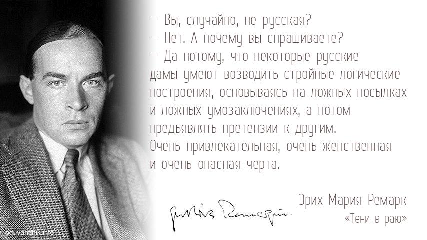 | — Вы, случайно, не русская? — Нет. А почему вы спрашиваете? — Да потому, что некоторые русские дамы умеют возводить стройные логические построения, основываясь на ложных посылках и ложных умозаключениях, а потом предъявлять претензии к другим. Очень привлекательная, очень женственная и очень опасная черта. |