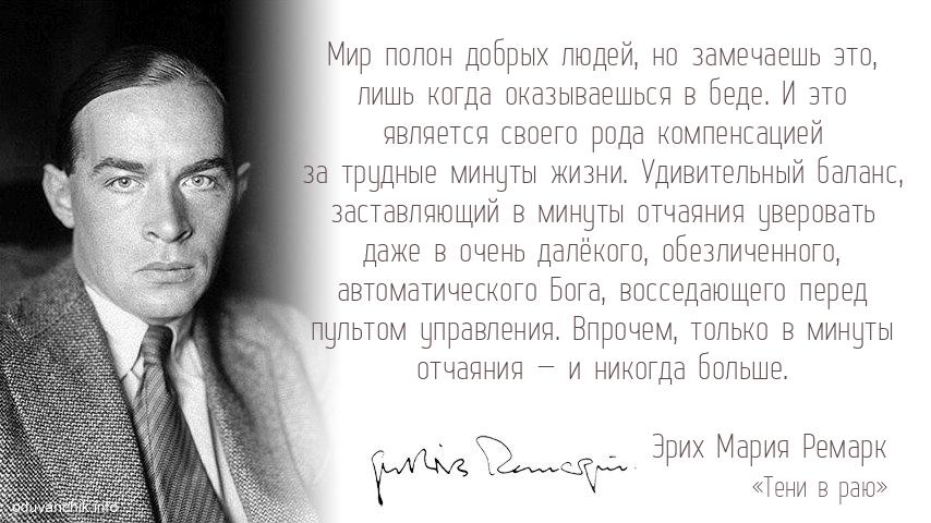 «Мир полон добрых людей, но замечаешь это, лишь когда оказываешься в беде. И это является своего рода компенсацией за трудные минуты жизни. Удивительный баланс, заставляющий в минуты отчаяния уверовать даже в очень далёкого, обезличенного, автоматического Бога, восседающего перед пультом управления. Впрочем, только в минуты отчаяния — и никогда больше.»