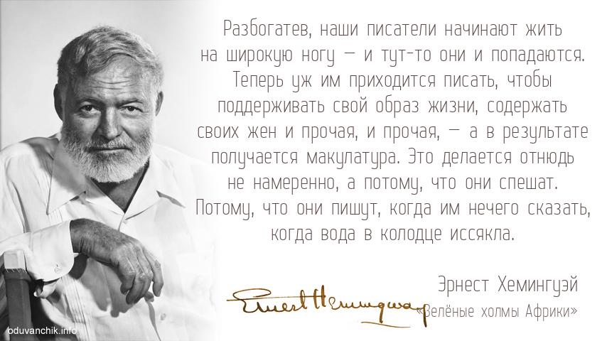 «Разбогатев, наши писатели начинают жить на широкую ногу — и тут-то они и попадаются. Теперь уж им приходится писать, чтобы поддерживать свой образ жизни, содержать своих жен и прочая, и прочая, — а в результате получается макулатура. Это делается отнюдь не намеренно, а потому, что они спешат. Потому, что они пишут, когда им нечего сказать, когда вода в колодце иссякла.»
