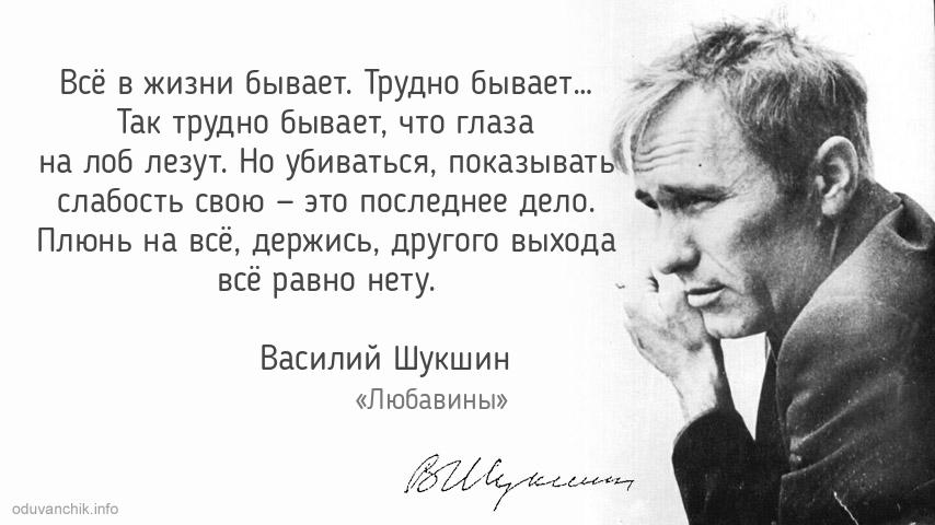 | Всё в жизни бывает. Трудно бывает… Так трудно бывает, что глаза на лоб лезут. Но убиваться, показывать слабость свою — это последнее дело. Плюнь на всё, держись, другого выхода всё равно нету. |