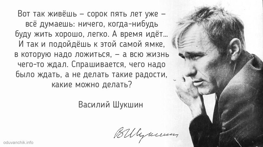 «Вот так живёшь — сорок пять лет уже — всё думаешь: ничего, когда-нибудь буду жить хорошо, легко. А время идёт… И так и подойдёшь к этой самой ямке, в которую надо ложиться, — а всю жизнь чего-то ждал. Спрашивается, чего надо было ждать, а не делать такие радости, какие можно делать?»