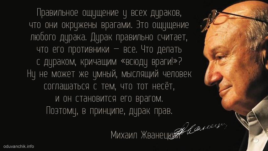 | Правильное ощущение у всех дураков, что они окружены врагами. Это ощущение любого дурака. Дурак правильно считает, что его противники — все. Что делать с дураком, кричащим «всюду враги!»? Ну не может же умный, мыслящий человек соглашаться с тем, что тот несёт, и он становится его врагом. Поэтому, в принципе, дурак прав. |