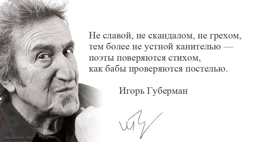 | Не славой, не скандалом, не грехом, тем более не устной канителью — поэты поверяются стихом, как бабы проверяются постелью. |