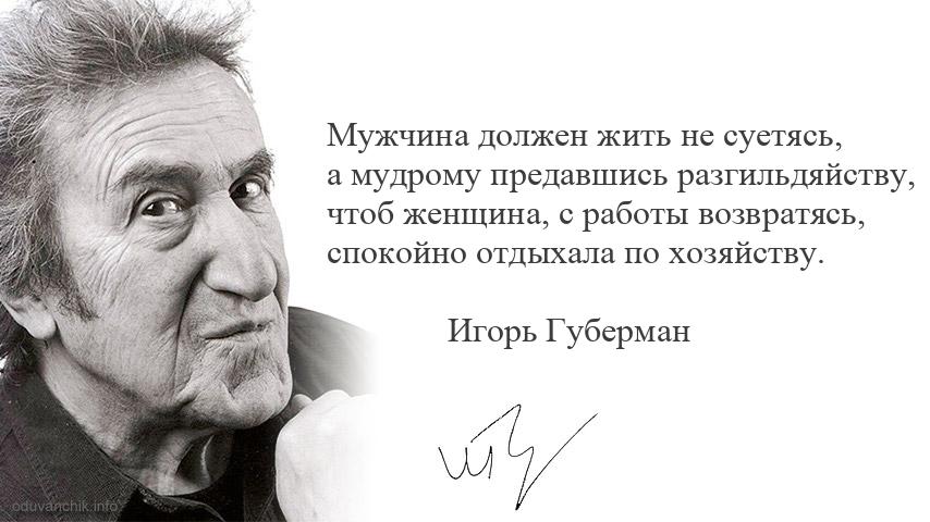 | Мужчина должен жить не суетясь, а мудрому предавшись разгильдяйству, чтоб женщина, с работы возвратясь, спокойно отдыхала по хозяйству. |
