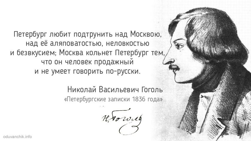 | Петербург любит подтрунить над Москвою, над её аляповатостью, неловкостью и безвкусием; Москва кольнет Петербург тем, что он человек продажный и не умеет говорить по-русски. |