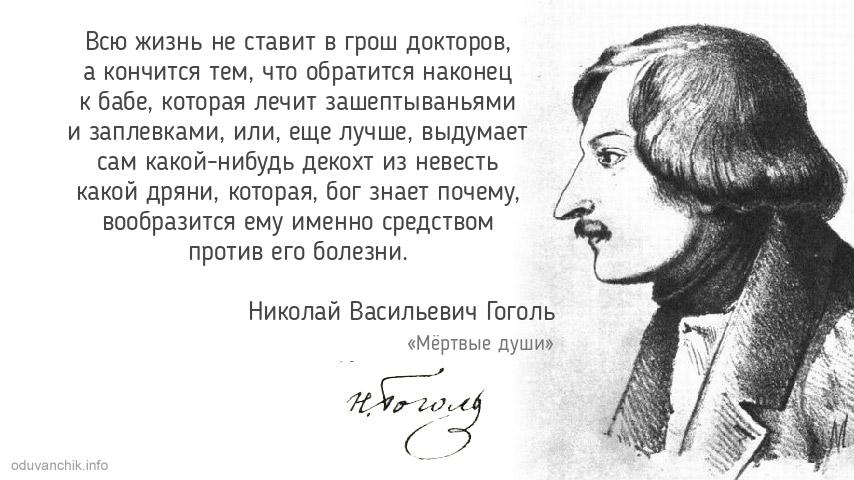 «Всю жизнь не ставит в грош докторов, а кончится тем, что обратится наконец к бабе, которая лечит зашептываньями и заплевками, или, еще лучше, выдумает сам какой-нибудь декохт из невесть какой дряни, которая, бог знает почему, вообразится ему именно средством против его болезни.»