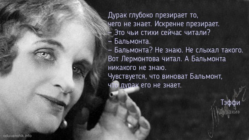 | Дурак глубоко презирает то, чего не знает. Искренне презирает. — Это чьи стихи сейчас читали? — Бальмонта. — Бальмонта? Не знаю. Не слыхал такого. Вот Лермонтова читал. А Бальмонта никакого не знаю. Чувствуется, что виноват Бальмонт, что дурак его не знает. |