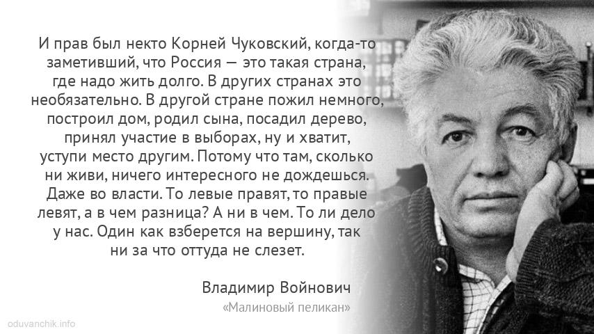«И прав был некто Корней Чуковский, когда-то заметивший, что Россия — это такая страна, где надо жить долго. В других странах это необязательно. В другой стране пожил немного, построил дом, родил сына, посадил дерево, принял участие в выборах, ну и хватит, уступи место другим. Потому что там, сколько ни живи, ничего интересного не дождешься. Даже во власти. То левые правят, то правые левят, а в чем разница? А ни в чем. То ли дело у нас. Один как взберется на вершину, так ни за что оттуда не слезет.»