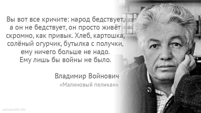 | Вы вот все кричите: народ бедствует, а он не бедствует, он просто живёт скромно, как привык. Хлеб, картошка, солёный огурчик, бутылка с получки, ему ничего больше не надо. Ему лишь бы войны не было. |
