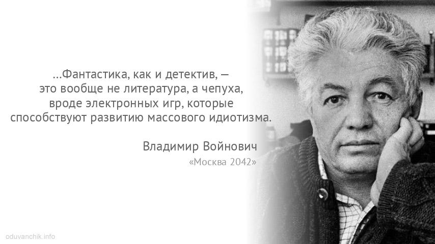 | …Фантастика, как и детектив, — это вообще не литература, а чепуха, вроде электронных игр, которые способствуют развитию массового идиотизма. |