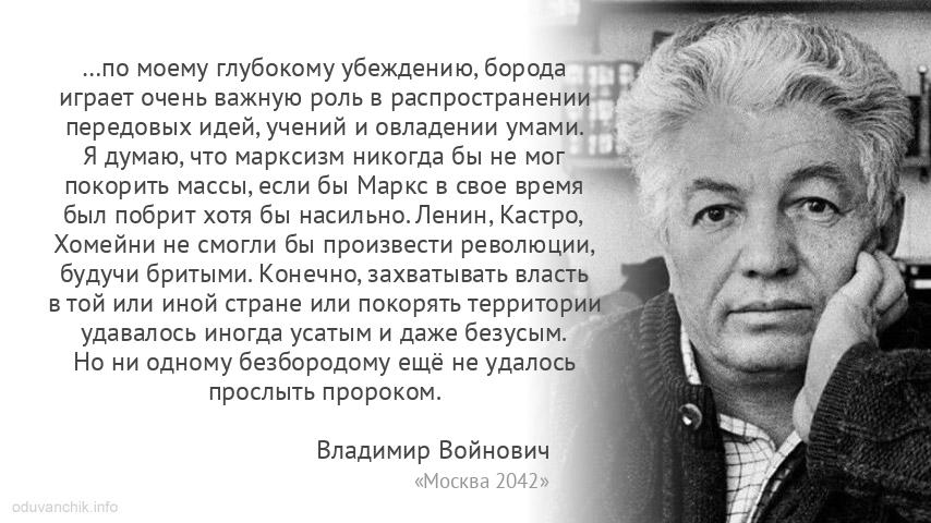| …по моему глубокому убеждению, борода играет очень важную роль в распространении передовых идей, учений и овладении умами. Я думаю, что марксизм никогда бы не мог покорить массы, если бы Маркс в свое время был побрит хотя бы насильно. Ленин, Кастро, Хомейни не смогли бы произвести революции, будучи бритыми. Конечно, захватывать власть в той или иной стране или покорять территории удавалось иногда усатым и даже безусым. Но ни одному безбородому ещё не удалось прослыть пророком. |