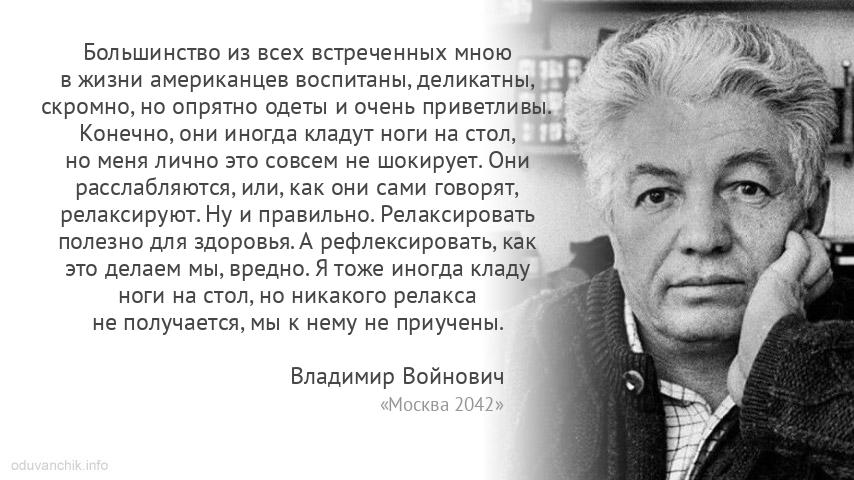 | Большинство из всех встреченных мною в жизни американцев воспитаны, деликатны, скромно, но опрятно одеты и очень приветливы. Конечно, они иногда кладут ноги на стол, но меня лично это совсем не шокирует. Они расслабляются, или, как они сами говорят, релаксируют. Ну и правильно. Релаксировать полезно для здоровья. А рефлексировать, как это делаем мы, вредно. Я тоже иногда кладу ноги на стол, но никакого релакса не получается, мы к нему не приучены. |