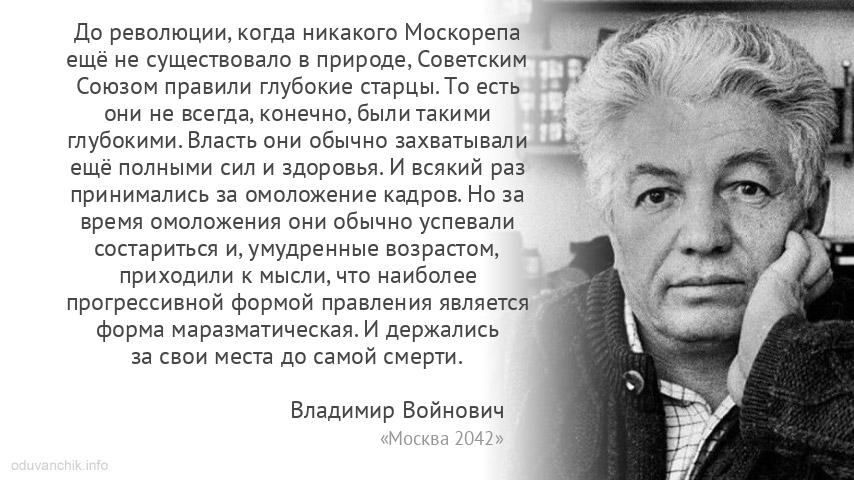 | До революции, когда никакого Москорепа ещё не существовало в природе, Советским Союзом правили глубокие старцы. То есть они не всегда, конечно, были такими глубокими. Власть они обычно захватывали ещё полными сил и здоровья. И всякий раз принимались за омоложение кадров. Но за время омоложения они обычно успевали состариться и, умудренные возрастом, приходили к мысли, что наиболее прогрессивной формой правления является форма маразматическая. И держались за свои места до самой смерти. |