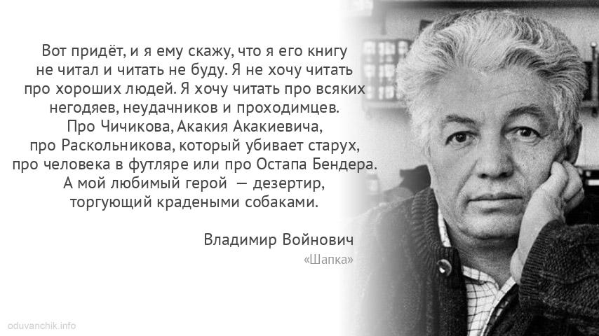 | Вот придёт, и я ему скажу, что я его книгу не читал и читать не буду. Я не хочу читать про хороших людей. Я хочу читать про всяких негодяев, неудачников и проходимцев. Про Чичикова, Акакия Акакиевича, про Раскольникова, который убивает старух, про человека в футляре или про Остапа Бендера. А мой любимый герой — дезертир, торгующий крадеными собаками. |