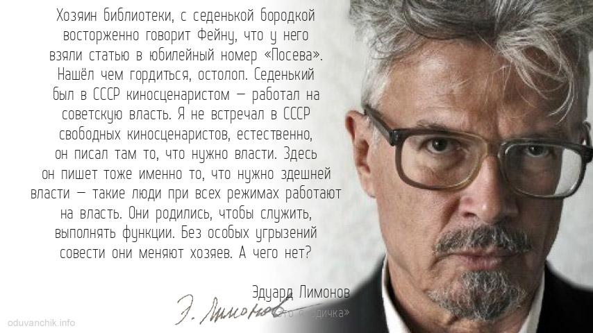 «Хозяин библиотеки, с седенькой бородкой восторженно говорит Фейну, что у него взяли статью в юбилейный номер «Посева». Нашёл чем гордиться, остолоп. Седенький был в СССР киносценаристом — работал на советскую власть. Я не встречал в СССР свободных киносценаристов, естественно, он писал там то, что нужно власти. Здесь он пишет тоже именно то, что нужно здешней власти — такие люди при всех режимах работают на власть. Они родились, чтобы служить, выполнять функции. Без особых угрызений совести они меняют хозяев. А чего нет?»