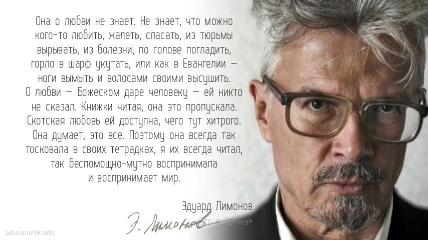 «Она о любви не знает. Не знает, что можно кого-то любить, жалеть, спасать, из тюрьмы вырывать, из болезни, по голове погладить, горло в шарф укутать, или как в Евангелии — ноги вымыть и волосами своими высушить. О любви — Божеском даре человеку — ей никто не сказал. Книжки читая, она это пропускала. Скотская любовь ей доступна, чего тут хитрого. Она думает, это все. Поэтому она всегда так тосковала в своих тетрадках, я их всегда читал, так беспомощно-мутно воспринимала и воспринимает мир.»