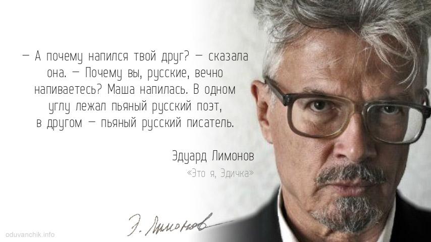 «— А почему напился твой друг? — сказала она. — Почему вы, русские, вечно напиваетесь? Маша напилась. В одном углу лежал пьяный русский поэт, в другом — пьяный русский писатель.»