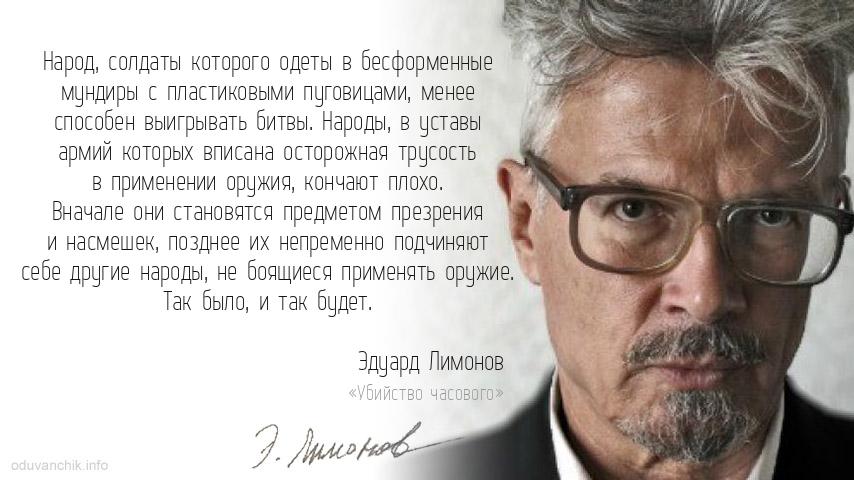 «Народ, солдаты которого одеты в бесформенные мундиры с пластиковыми пуговицами, менее способен выигрывать битвы. Народы, в уставы армий которых вписана осторожная трусость в применении оружия, кончают плохо. Вначале они становятся предметом презрения и насмешек, позднее их непременно подчиняют себе другие народы, не боящиеся применять оружие. Так было, и так будет.»