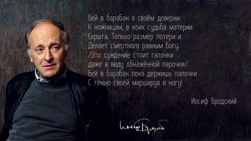 | Бей в барабан о своём доверии К ножницам, в коих судьба материи Скрыта. Только размер потери и Делает смертного равным Богу. /Это суждение стоит галочки даже в виду обнажённой парочки/ Бей в барабан пока держишь палочки С тенью своей маршируя в ногу! |
