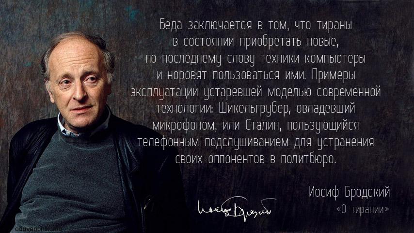 «Беда заключается в том, что тираны в состоянии приобретать новые, по последнему слову техники компьютеры и норовят пользоваться ими. Примеры эксплуатации устаревшей моделью современной технологии: Шикельгрубер, овладевший микрофоном, или Сталин, пользующийся телефонным подслушиванием для устранения своих оппонентов в политбюро.»