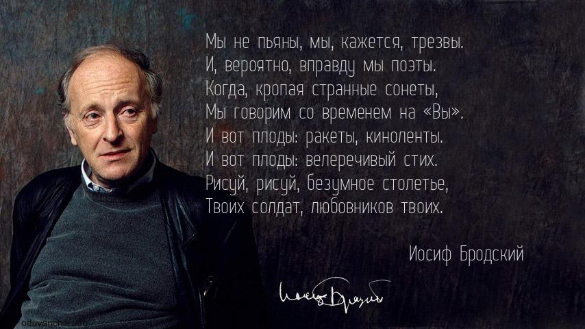| Мы не пьяны, мы, кажется, трезвы. И, вероятно, вправду мы поэты. Когда, кропая странные сонеты, Мы говорим со временем на «Вы». И вот плоды: ракеты, киноленты. И вот плоды: велеречивый стих. Рисуй, рисуй, безумное столетье, Твоих солдат, любовников твоих. |