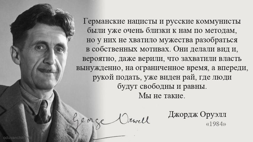 «Германские нацисты и русские коммунисты были уже очень близки к нам по методам, но у них не хватило мужества разобраться в собственных мотивах. Они делали вид и, вероятно, даже верили, что захватили власть вынужденно, на ограниченное время, а впереди, рукой подать, уже виден рай, где люди будут свободны и равны. Мы не такие.»