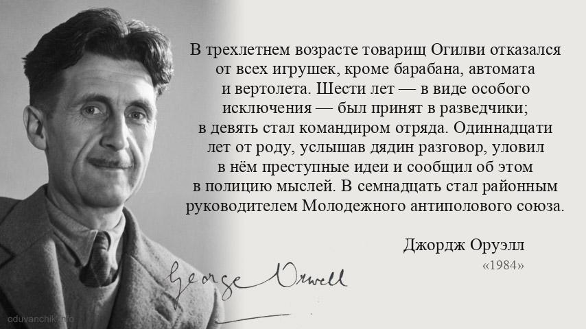 «В трехлетнем возрасте товарищ Огилви отказался от всех игрушек, кроме барабана, автомата и вертолета. Шести лет — в виде особого исключения — был принят в разведчики; в девять стал командиром отряда. Одиннадцати лет от роду, услышав дядин разговор, уловил в нём преступные идеи и сообщил об этом в полицию мыслей. В семнадцать стал районным руководителем Молодежного антиполового союза.»