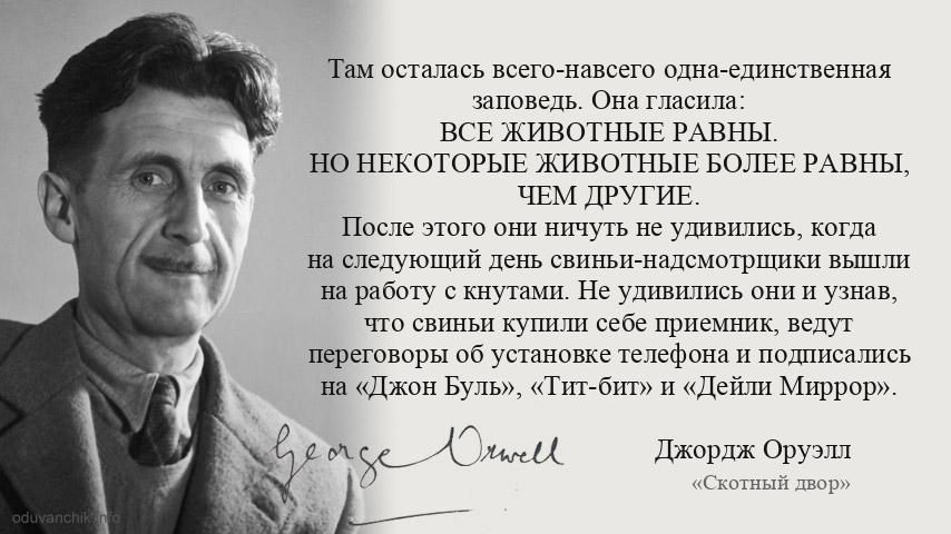| Там осталась всего-навсего одна-единственная заповедь. Она гласила: ВСЕ ЖИВОТНЫЕ РАВНЫ. НО НЕКОТОРЫЕ ЖИВОТНЫЕ БОЛЕЕ РАВНЫ, ЧЕМ ДРУГИЕ. После этого они ничуть не удивились, когда на следующий день свиньи-надсмотрщики вышли на работу с кнутами. Не удивились они и узнав, что свиньи купили себе приемник, ведут переговоры об установке телефона и подписались на «Джон Буль», «Тит-бит» и «Дейли Миррор». |