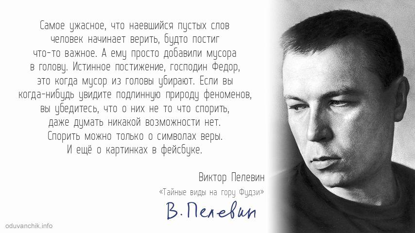 | Самое ужасное, что наевшийся пустых слов человек начинает верить, будто постиг что-то важное. А ему просто добавили мусора в голову. Истинное постижение, господин Федор, это когда мусор из головы убирают. Если вы когда-нибудь увидите подлинную природу феноменов, вы убедитесь, что о них не то что спорить, даже думать никакой возможности нет. Спорить можно только о символах веры. И ещё о картинках в фейсбуке. |